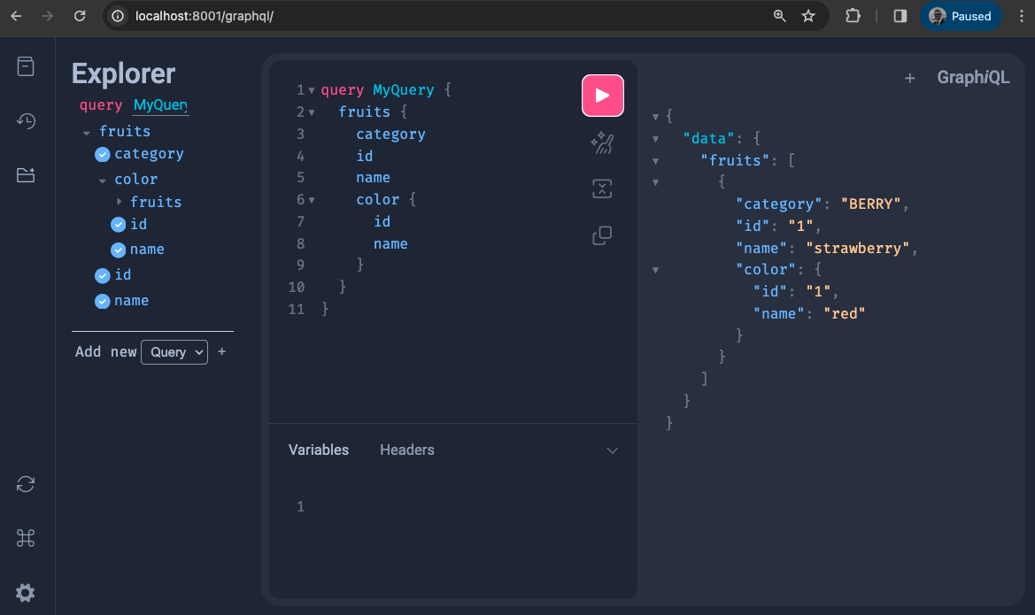 Then visit localhost:8000/graphql in your browser. You should see the graphql explorer being served by django. Using the interactive query tool, you can query for the fruits you added earlier: